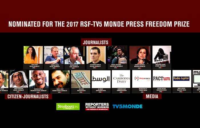 Por medio de su página oficial, Reporteros Sin Fronteras (RSF) dio a conocer a los nominados para el Premio Libertad de Prensa 2017, el cual es otorgado por la organización y por TV5-Monde. Este año, son 18 los nominados, entre los cuales se encuentran periodistas, ciudadanos periodistas, medios de comunicaciones y fueron elegidos por su compromiso y profesionalismo.
