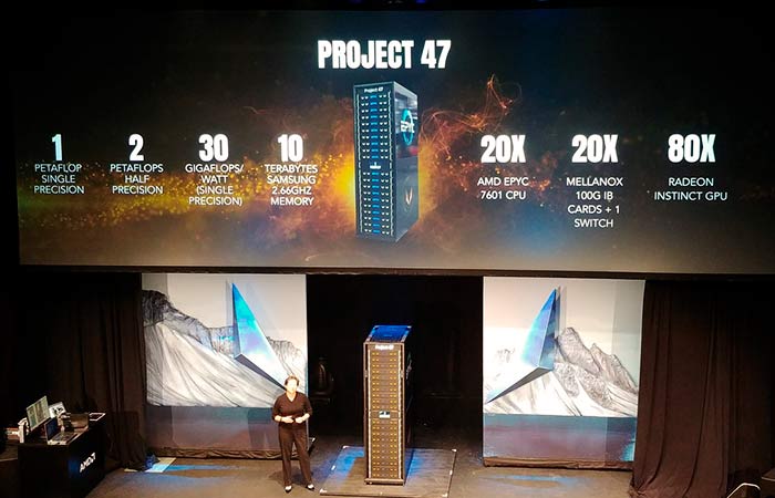 Project 47 fue creado en colaboración con Inventec y combina 20 CPUS de 32 núcleos, además de otros 80 GPUs Radeon Instinct. Además de sus grandes capacidades de procesamiento,su construcción especial le permite operar a 30 gigaFLOPs de potencia (10 veces la capacidad de una computadora personal)mientras utiliza únicamente 1 watt de energía; la misma energía necesaria para que un dispositivo móvil reciba y emita comunicaciones.