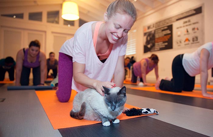 Por otro lado, una de las característicasprincipales de los gatos es que son tranquilos y tienen una flexibilidad impresionante, lo que hace muy común relacionarlos con algunas posturas que se practican durante las clases. La dinámicaes la siguiente: mientras las personas realizan las posiciones, los gatitos pueden recorrer libremente el salón, acercándose a todos y en la mayoría de las ocasiones, se subena los alumnos durante el ejercicio.