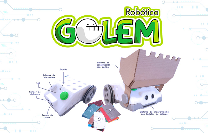 Golemes un pequeño robot programable que toma su nombre del monstruo de barro descrito por la mitología hebrea-judía, un autómataincapaz de tomar decisiones por sí solo, cuyas acciones dependían enteramente de las instrucciones a él proporcionadas, las cuales seguía de manera puntual. A través de tarjetas de colores(no se requiere una computadora para programar), los alumnos pueden programaral Golem robótico, decirle si debe avanzar en línea recta, por cuánto tiempo, en qué momento debe girar y hacia donde, entre muchos otros comandos; en las tarjetas símbolos son asociados a cada instrucción, así los niños pueden practicar por escrito antes de programar el Golem; además, es un robot orgulloso de sus orígenes dentro de la cultura makery, por ende, es capaz de transformarse, por ejemplo, en una barredora o un gladiador, gracias a placas de cartón precortadas diseñadas para construir diversos aditamientos.