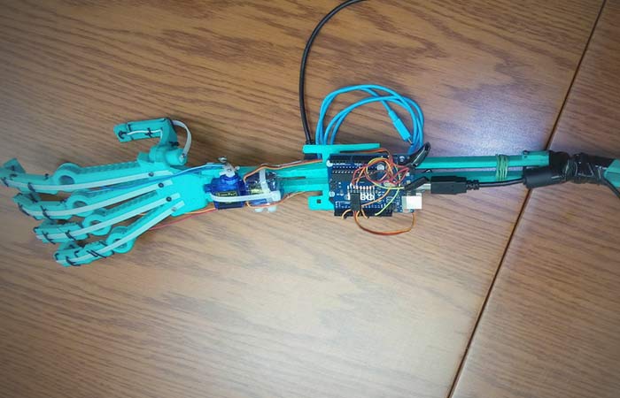 Actualmente, elbrazo robótico posee una mano de 5 dedos, cada uno equipado con un servomotor de engranaje eléctrico el cual permite al estudianterealizar múltiples movimientos específicos. De poder perfeccionar la transmisión y recepción de los sensores, los profesorespodrían logar que su alumno pudiera doblar el codo con naturalidad, girar la muñeca en un movimiento de hasta 270 grados y mover los dedos de forma individual, conjunta o en combinaciones.